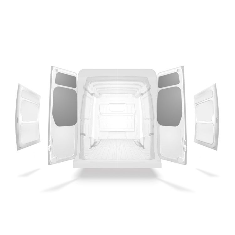 Fabrycznie wycięte okładziny tylnych drzwi samochodu dostawczego są dopasowane do górnej sekcji bliźniaczych drzwi pojazdu.