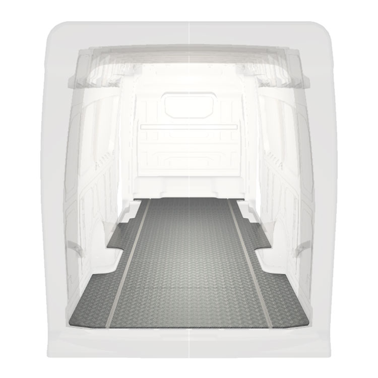 Lekkie i solidne standardowe podłogi do samochodów dostawczych Volkswagen Crafter / MAN TGE wyposażone w antypoślizgową aluminiową blachę ryflowaną i szyny na ładunek (wzdłużne) umożliwiające szybki i bezpieczny montaż systemów regałowych oraz innych akcesoriów.