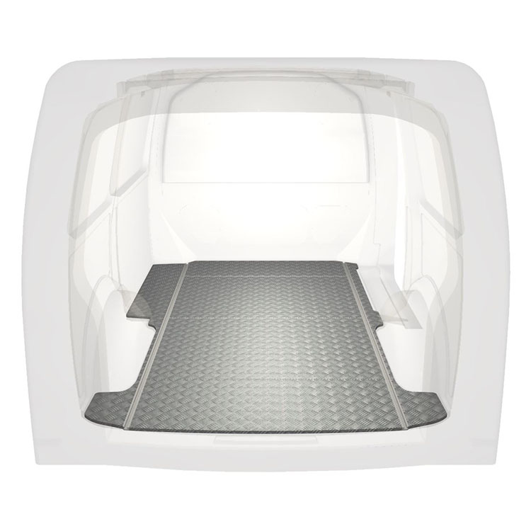 Lekkie i solidne standardowe podłogi do samochodów dostawczych Volkswagen Transporter T6 wyposażone w antypoślizgową aluminiową blachę ryflowaną i szyny na ładunek (wzdłużne) umożliwiające szybki i bezpieczny montaż systemów regałowych oraz innych akcesoriów.