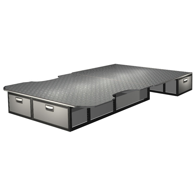 The kit is designed to be fitted on top of a Modul-Floor, utilizing the floor rails for a non-intrusive installation. The double floor is equipped with rails for easy installation of vehicle racking, and edging strips for a nice finish.