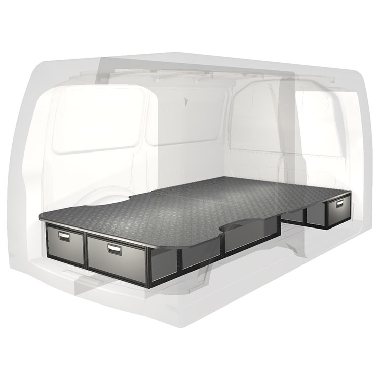 The kit is designed to be fitted on top of a wooden floor. The double floor is equipped with rails for easy installation of vehicle racking, and edging strips for a nice finish.