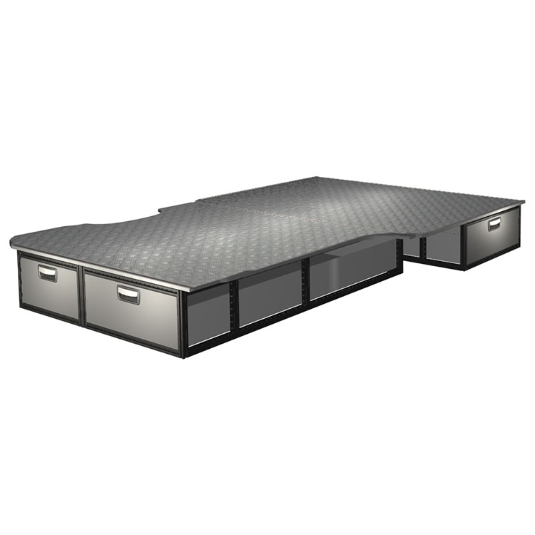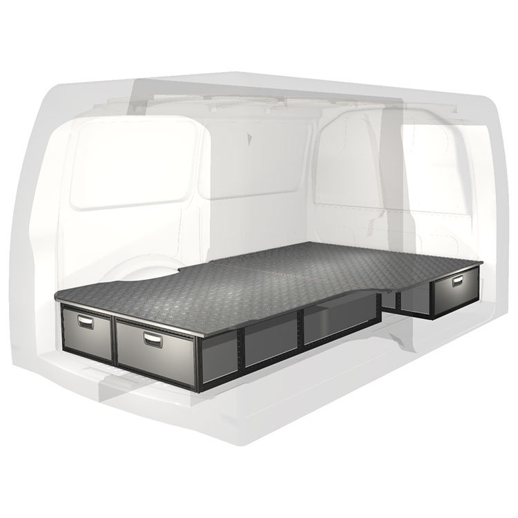 The kit is designed to be fitted on top of a wooden floor. The double floor is equipped with rails for easy installation of vehicle racking, and edging strips for a nice finish.