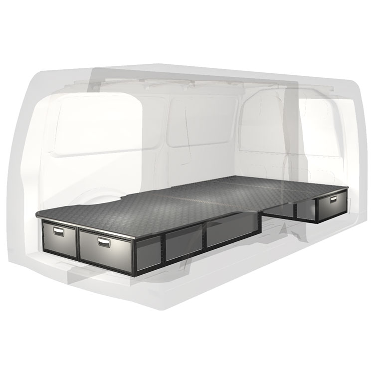 The kit is designed to be fitted on top of a wooden floor. The double floor is equipped with rails for easy installation of vehicle racking, and edging strips for a nice finish.
